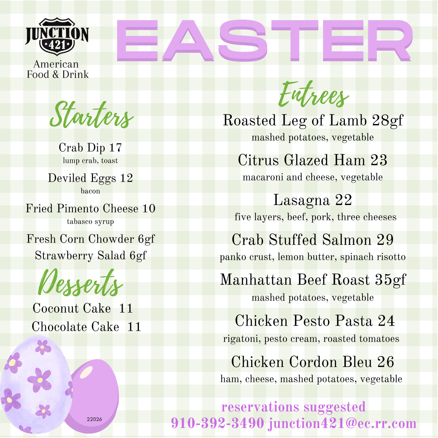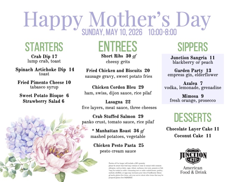 We serve American comfort food made with love from scratch. Our showcase bar is a great meeting place to relax with friends. Let us handle the details of your large gathering while you enjoy your guests. Junction 421 is locally owned and very much a part of the neighborhood fabric. Please visit us with your friends and family and enjoy our special brand of hospitality.